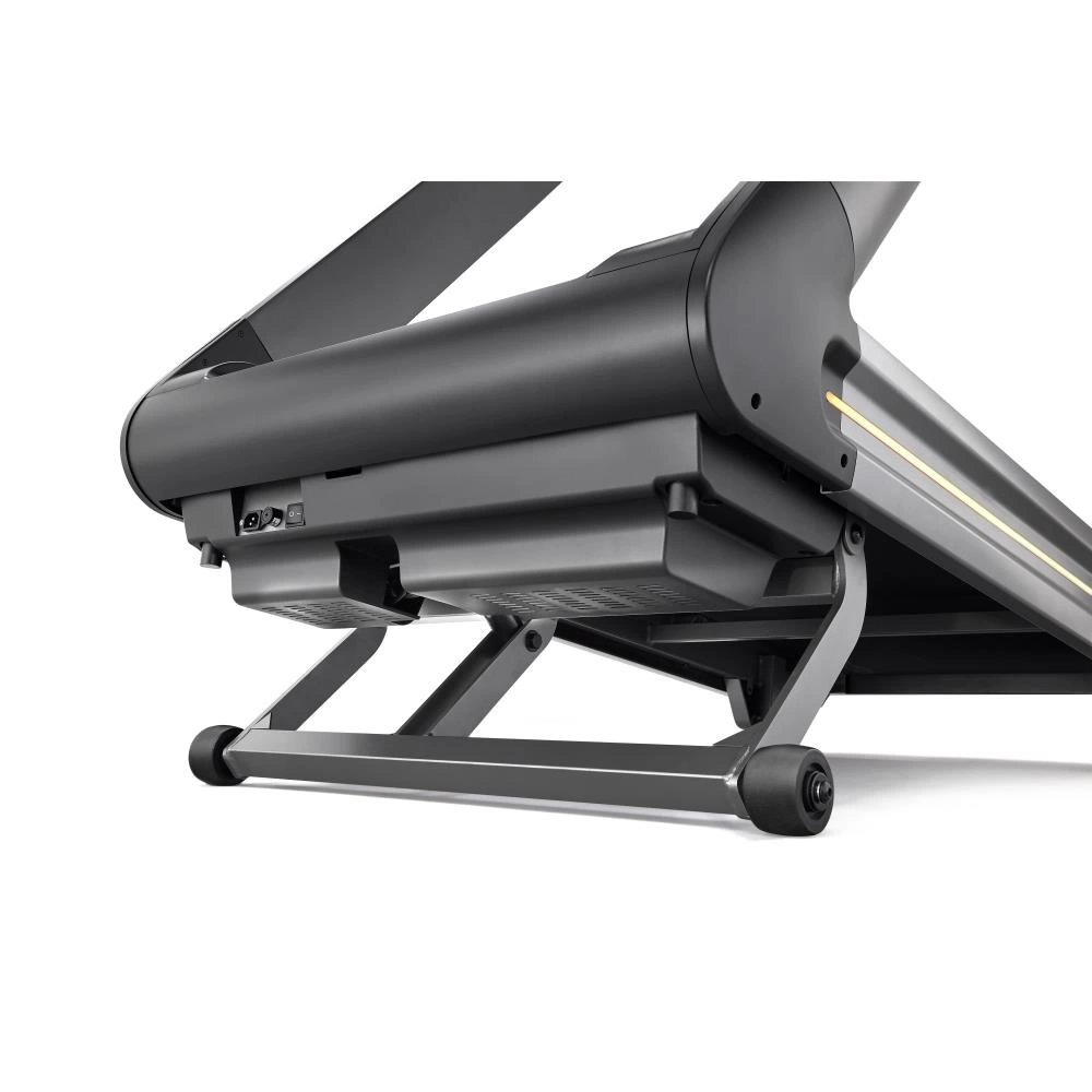 Wytrzymałe koła transportowe umożliwiają łatwe przemieszczanie się po domu. Bieżnia oferuje aż 18% nachylenia, co stanowi wyjątkowo wysoki poziom – niemal jak intensywny bieg pod górę w prawdziwym terenie (np. w górach).