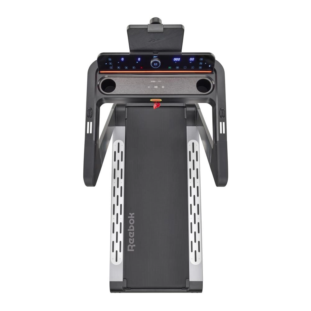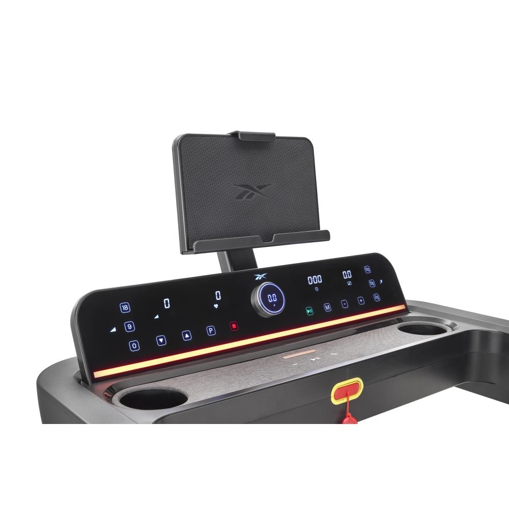 Bieżnia Reebok Z-TECH (SILNIK AC) wyposażona jest w ekran LED prezentujący kluczowe dane (prędkość, czas, dystans, kalorie, puls, nachylenie, tętno, waty, tłuszcz w organizmie), czujniki tętna na uchwytach, uchwyt na tablet do 15,6'' miejsce na butelkę oraz głośnik Bluetooth.