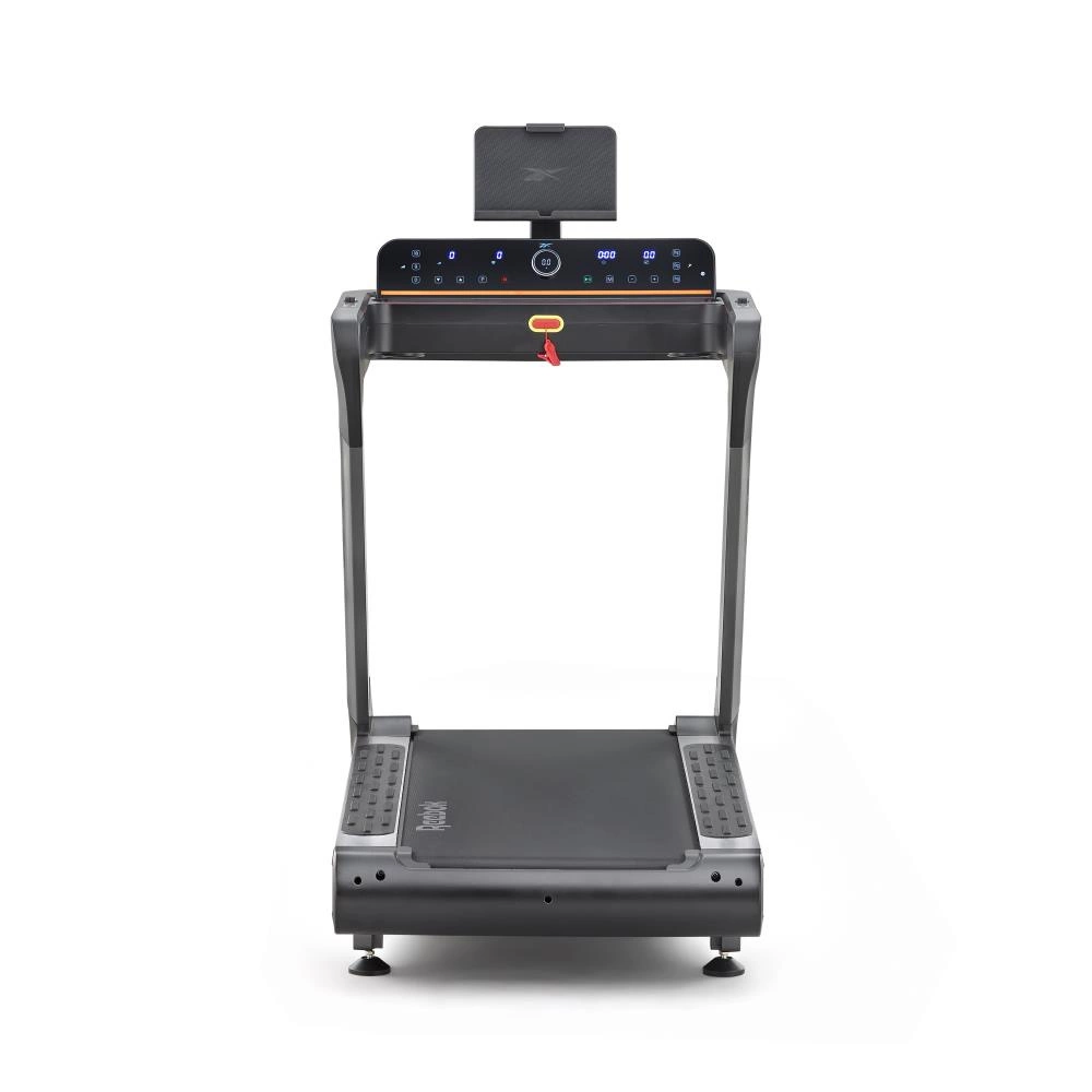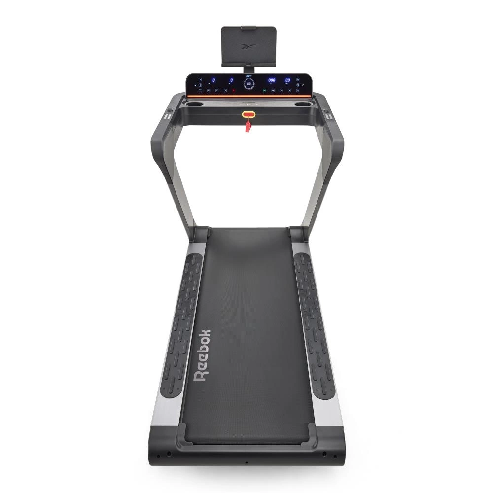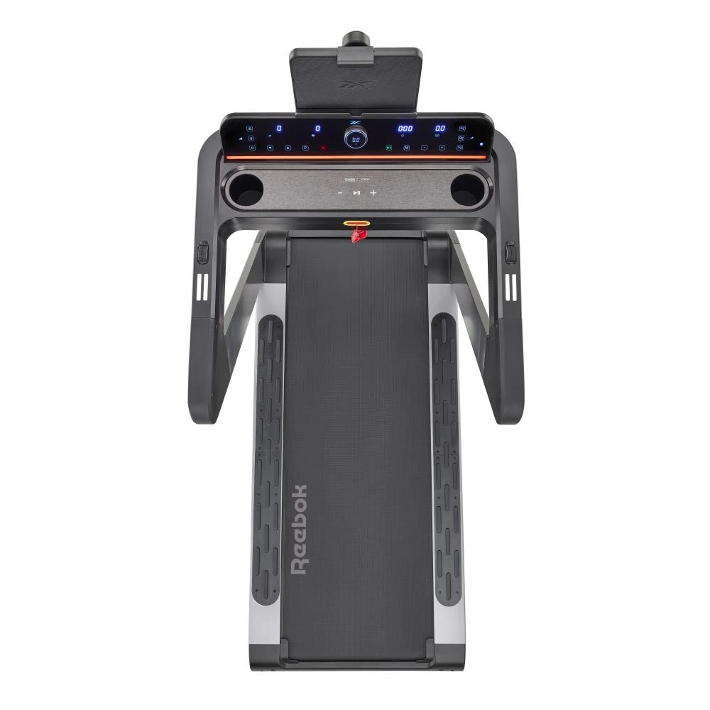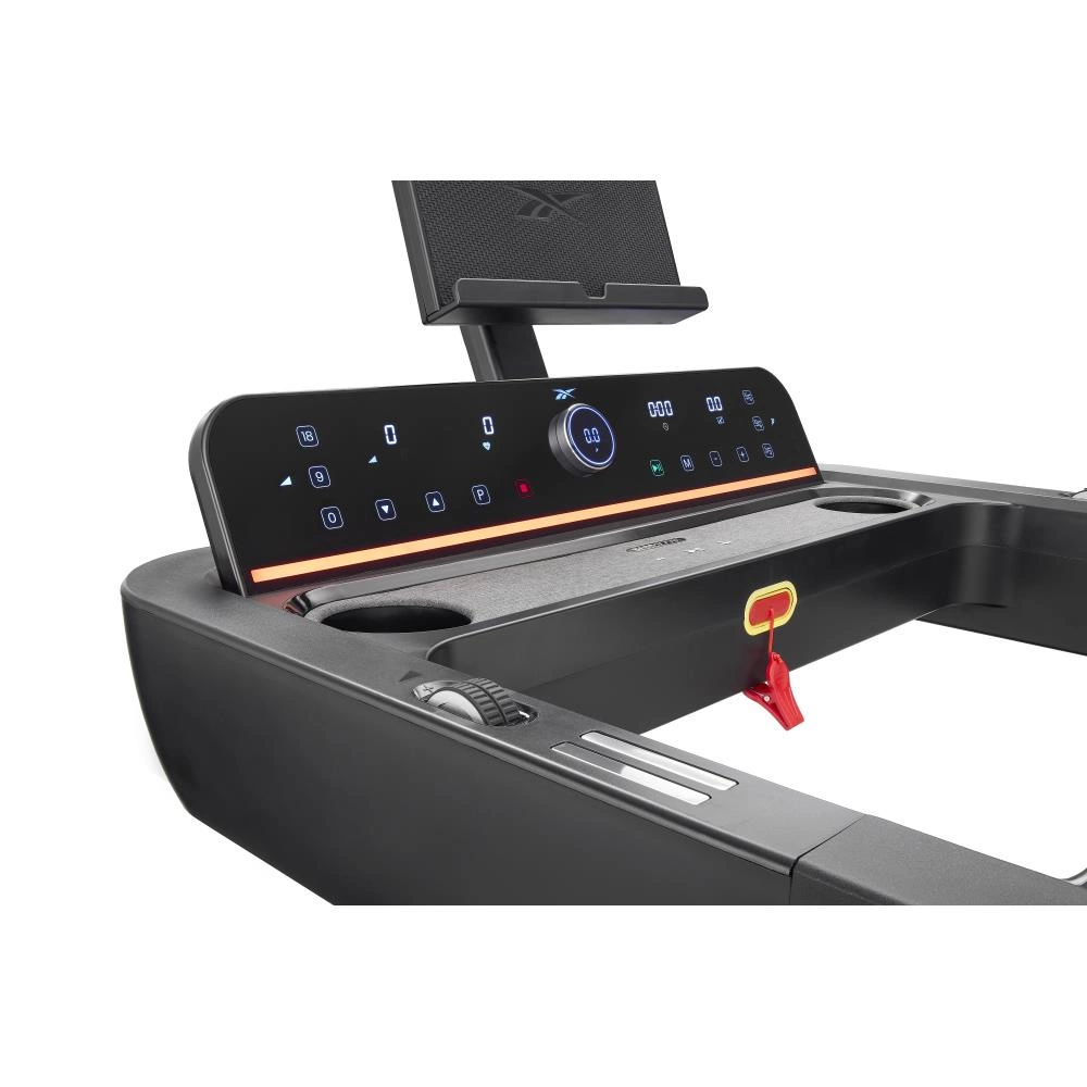 Bieżnia Reebok Z-TECH (SILNIK DC) wyposażona jest w ekran LED prezentujący kluczowe dane (czas, prędkość, dystans, nachylenie, tętno, kalorie), czujniki tętna na uchwytach, uchwyt na tablet do 15,6'' miejsce na butelkę oraz głośnik Bluetooth.