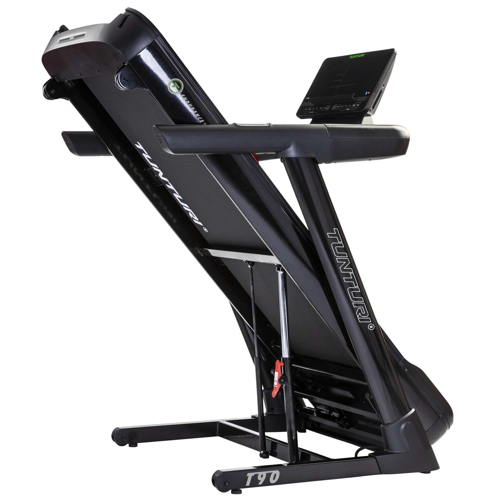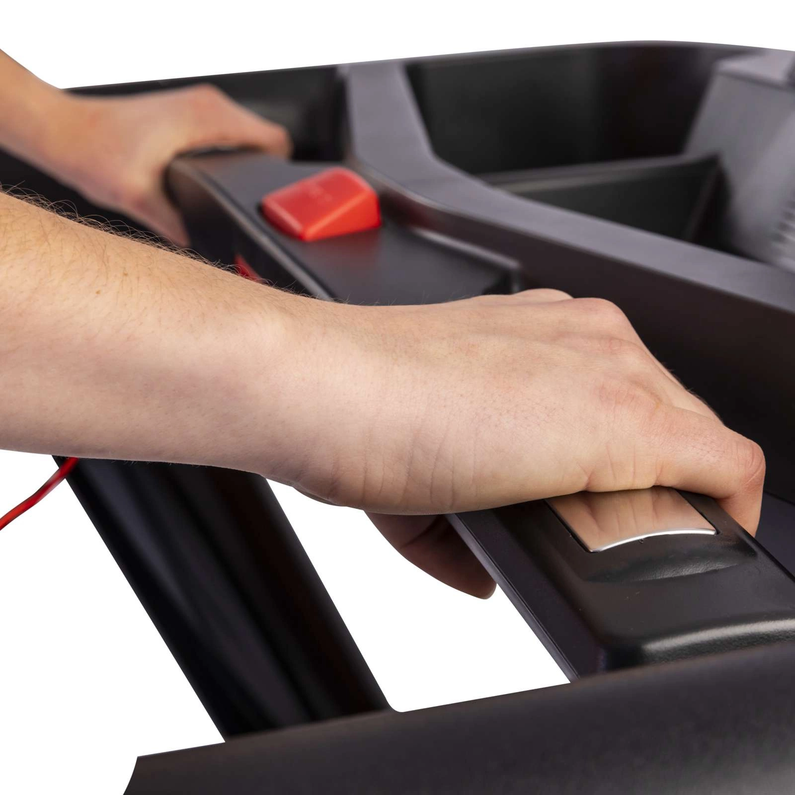 Bieżnia Tunturi Endurance T90 została wyposażona w system miękkiego opadania Soft Drop Folding, który umożliwia bezpieczne i kontrolowane złożenie bieżni bez ryzyka nagłego opadania. Dzięki tej technologii złożenie urządzenia po zakończonym treningu jest proste i nie wymaga wysiłku.
