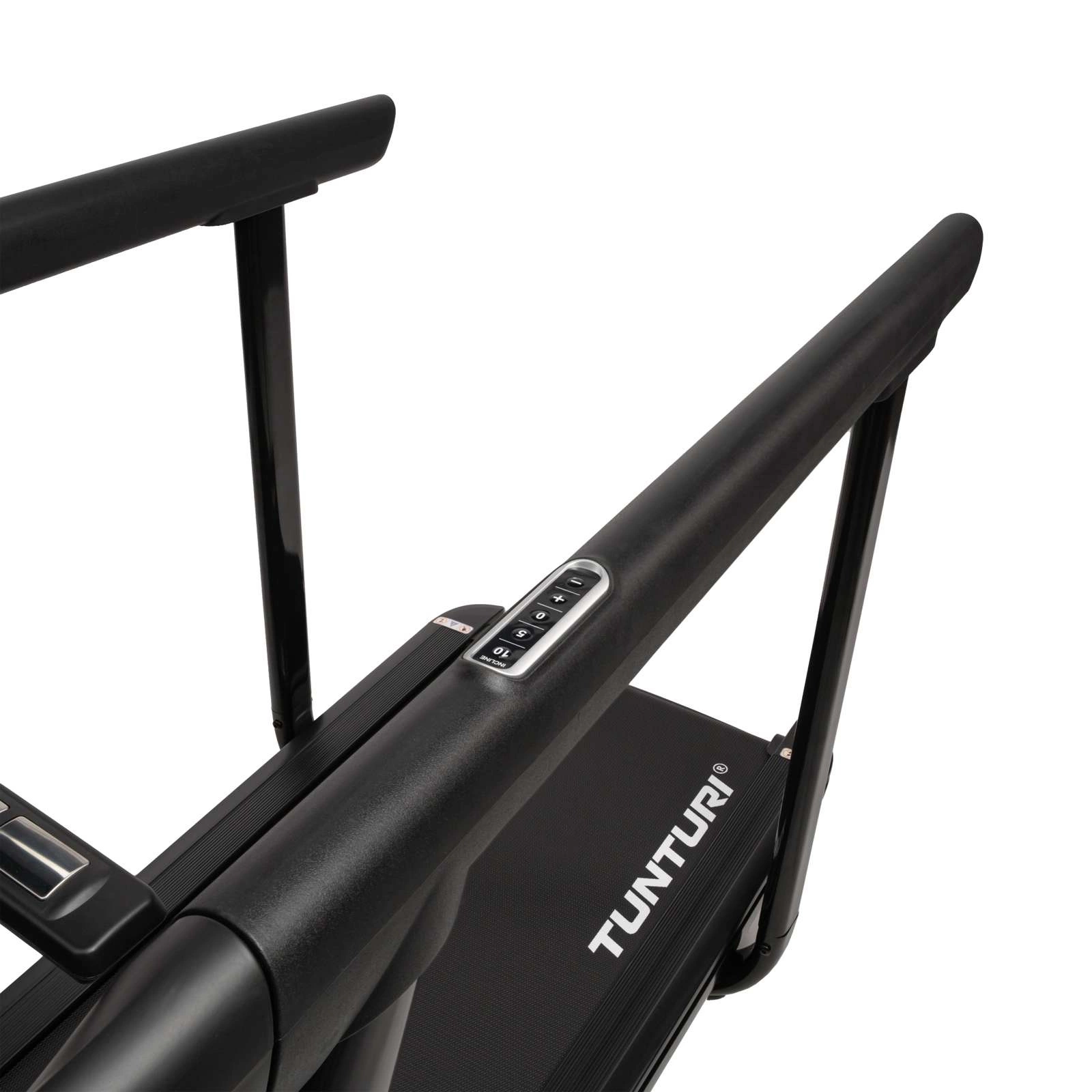 Bieżnia Tunturi Endurance T80 została zaprojektowana z myślą o maksymalnym komforcie użytkowania. Dzięki wygodnym przyciskom na uchwytach możesz łatwo dostosować prędkość oraz kąt nachylenia bez potrzeby sięgania do panelu sterowania. Wystarczy nacisnąć „+” lub „-” na lewym uchwycie, aby zmienić nachylenie, lub na prawym, aby dostosować prędkość biegu.