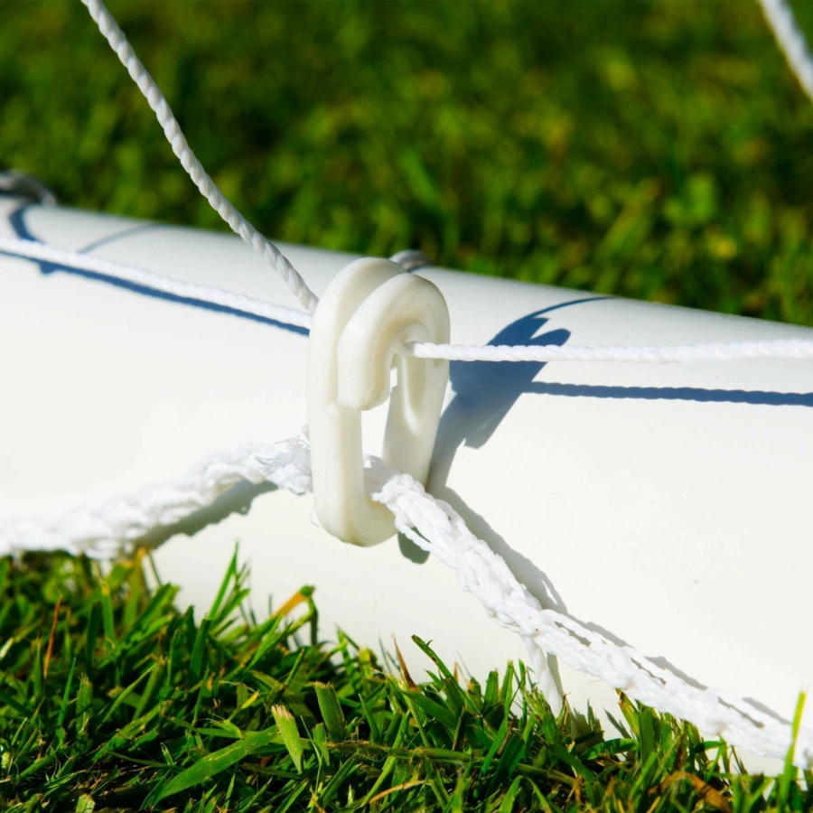 Bramka została wykonana z wytrzymałego uPVC ze specjalnie wzmocnionym tylnym profilem, co sprawia, że zachowuje pełną stabilność. Rama jest lekka, ale odporna na uderzenia piłki.Do zestawu dołączona jest siatka z HDPE 2 mm, poddana procesowi stabilizacji UV, dzięki czemu nie blaknie i nie zużywa się mimo ekspozycji na słońce i deszcz. Wzmocnione krawędzie gwarantują wieloletnią eksploatację.