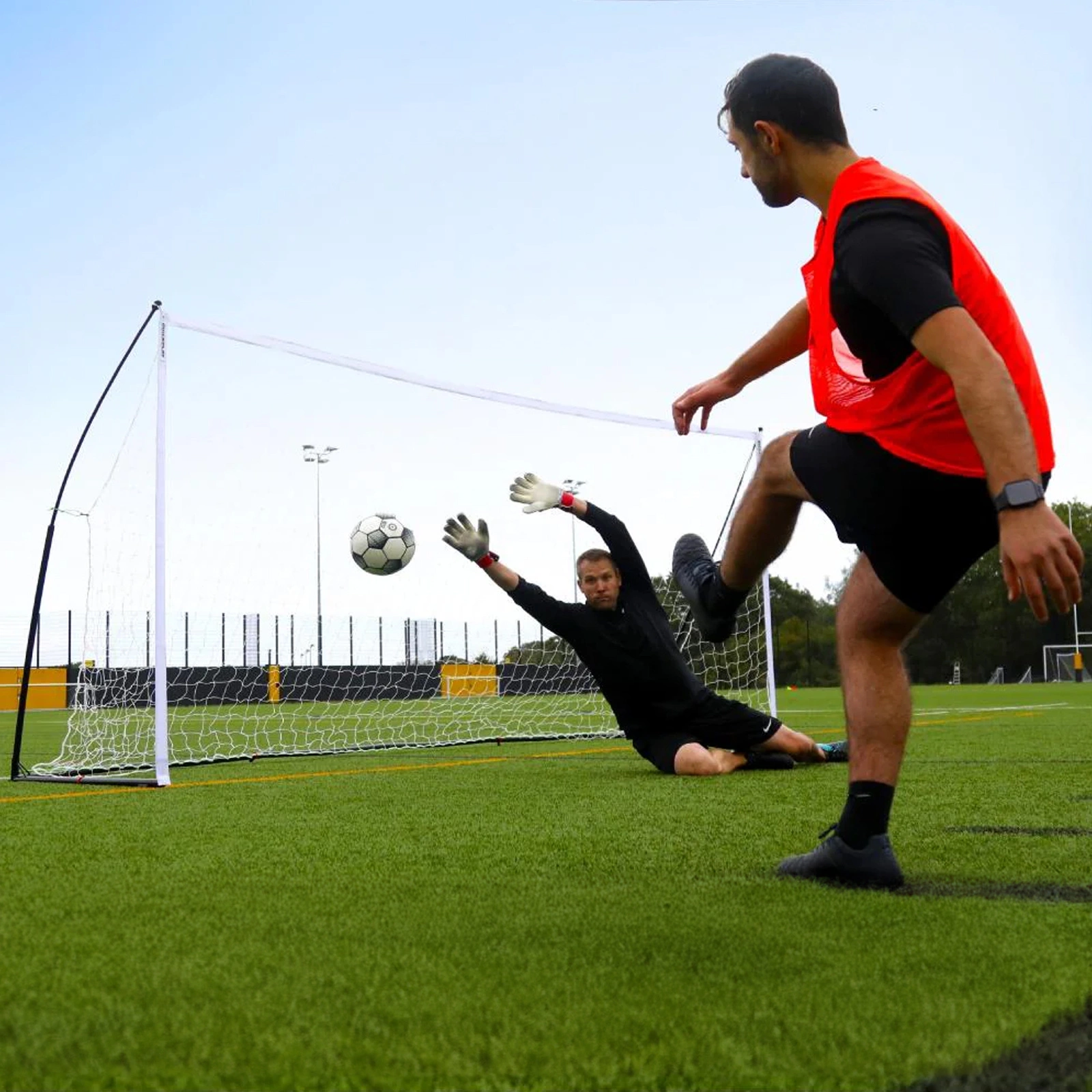 Elastyczna konstrukcja bramki skutecznie rozprasza energię strzału – piłka nie odbija się gwałtownie, lecz naturalnie się po niej ześlizguje.