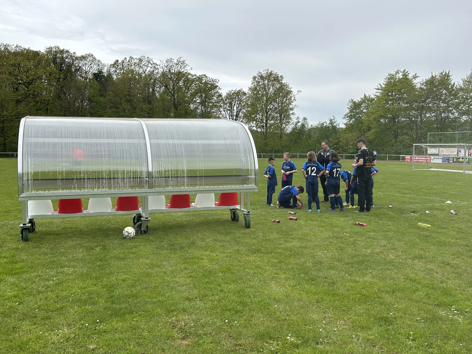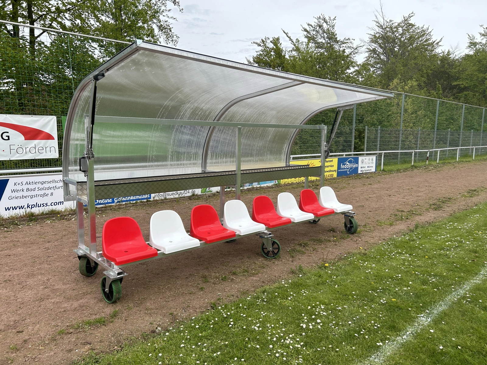 Ławka rezerwowych została zaprojektowana z myślą o obiektach, które wymagają możliwości szybkiego przemieszczania kabin. To jedyne rozwiązanie w pełni mobilne - wyposażone w sześć skrętnych kół, dzięki czemu kabinę można łatwo i bez wysiłku przestawiać między różnymi boiskami czy strefami obiektu.Seria wyróżnia się szeregiem praktycznych rozwiązań. Regulowany kąt nachylenia dachu pozwala dopasować ustawienie do warunków atmosferycznych: zapewnia dodatkową wentylację w upalne dni lub lepszą osłonę przed deszczem. Na całej szerokości kabiny znajduje się funkcjonalna półka, idealna na sprzęt, napoje i akcesoria. Dach wykonany jest z aluminium oraz poliwęglanu komorowego 4,5 mm, co gwarantuje trwałość i dobrą ochronę przed słońcem. Wysokość konstrukcji ok. 2,0 m zapewnia wygodę użytkowania.