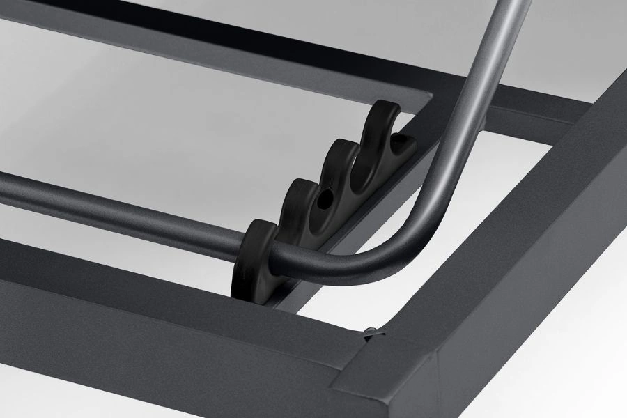 Dzięki regulowanemu oparciu w 4 różnych pozycjach, każdy znajdzie idealne ustawienie dla siebie. Miękkie poduszki dekoracyjne z eleganckim pikowaniem dodają nie tylko wygody, ale również stylu. Aby zapewnić jeszcze większy komfort i łatwiejsze korzystanie z leżaka, siedzisko znajduje się na wysokości 50 cm od ziemi, a jego szerokość wynosząca 90 cm zapewnia dużo swobody i komfortu.