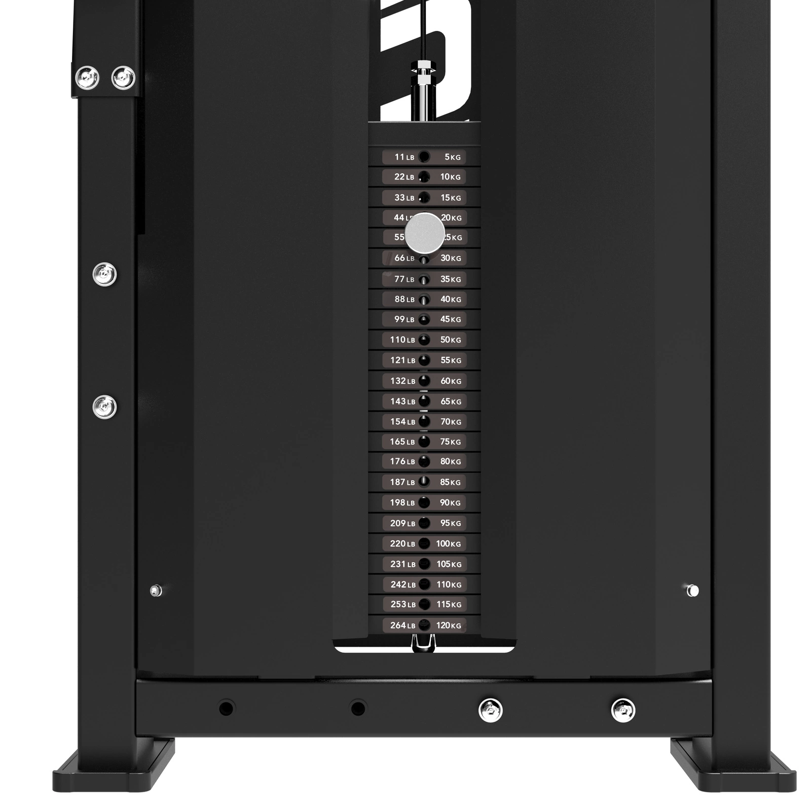 - Duży stos obciążeń - aż 120 kg z możliwością regulacji w krokach 2,5 lub 5 kg, co zapewnia precyzyjną progresję.