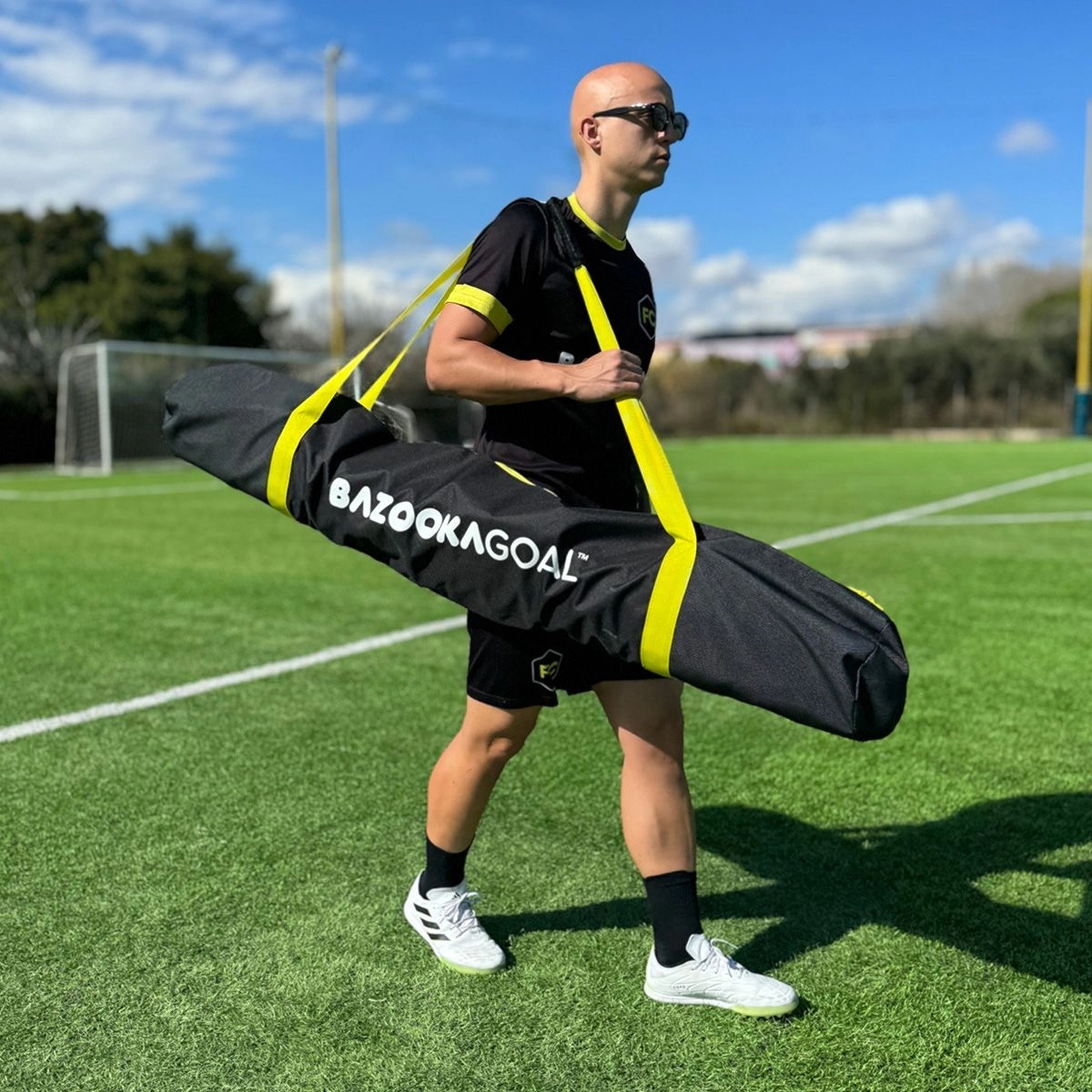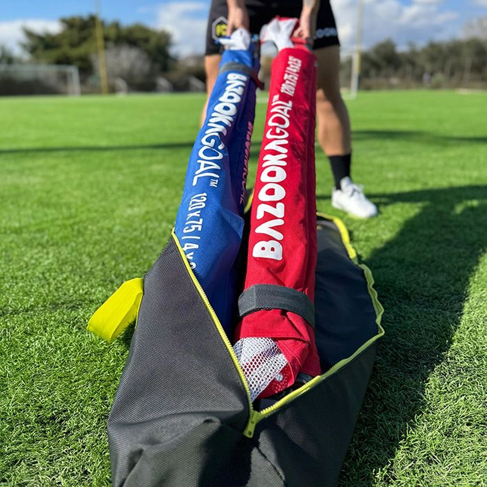 Torba na bramki BazookaGoal to wygodny sposób na przenoszenie swojego sprzętu treningowego. Wykonana z czarnego materiału, posiada żółty zamek błyskawiczny i paski na rzepy. Idealna dla trenerów, którzy używają wielu bramek BazookaGoal podczas sesji treningowych.