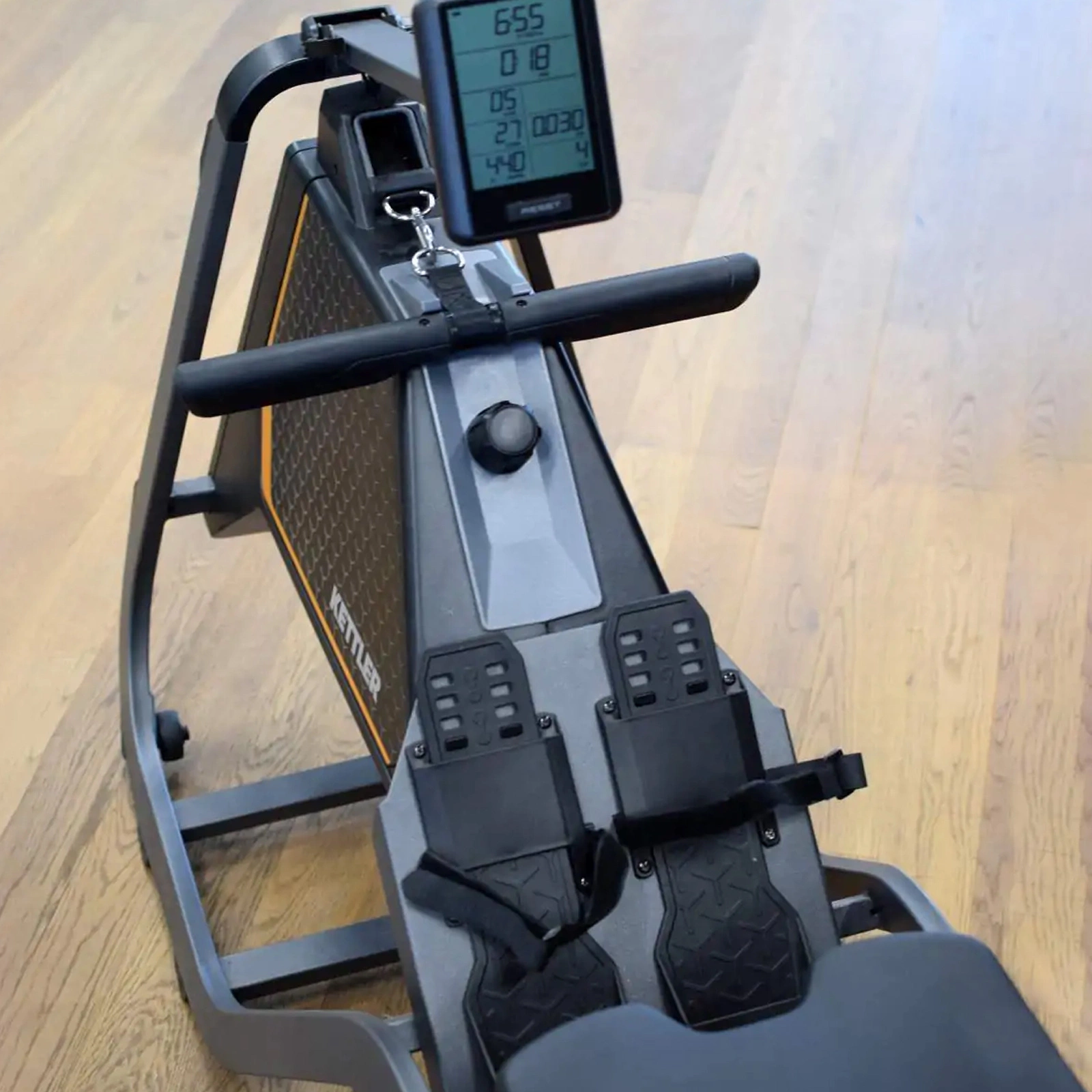 Wioślarz Regatta 300 umożliwia podstawowe dopasowanie pozycji treningowej dzięki regulowanym pedałom z paskami stabilizującymi stopy, co pozwala na bezpieczne wiosłowanie przy różnych rozmiarach obuwia. Rozwiązanie to wspiera stabilne prowadzenie ruchu podczas treningów o umiarkowanej intensywności.