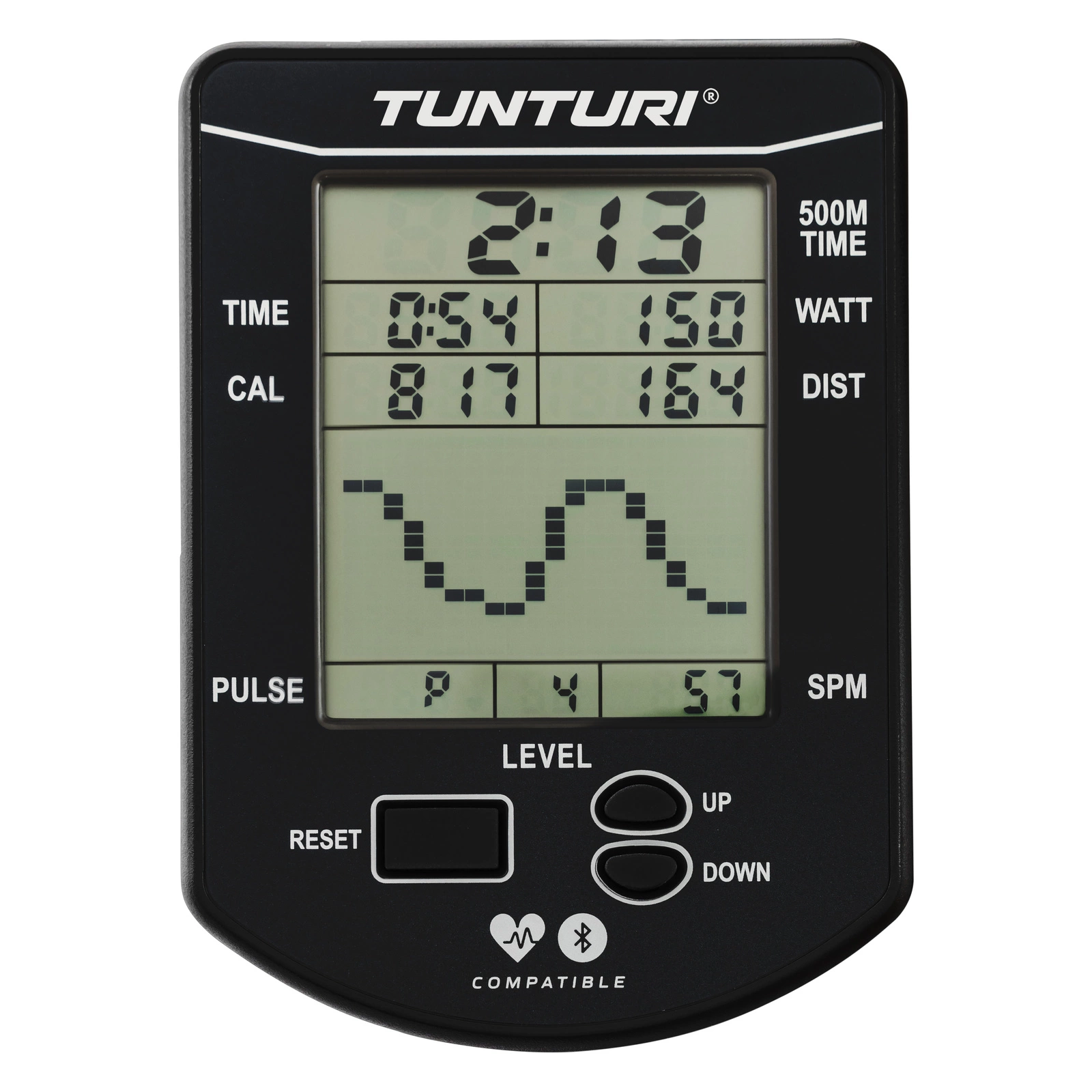 Monitor Bluetooth pokazuje czas, dystans, spalone kalorie, moc i liczbę wiosłowań na minutę. Unikalny Power Graph analizuje Twój ruch i pomaga dopracować technikę. Możesz też połączyć urządzenie z aplikacjami treningowymi (Fluid Connect, Regatta, Asensei, EXR, Tunturi Routes, Kinomap) i dostosować plan treningu do swoich celów.