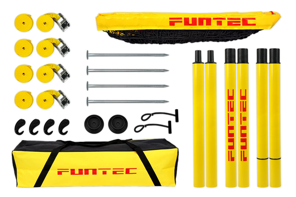 Funtec Beach Champ Set i Funtec Pro Beach Setwyposażone są w profesjonalną siatkę turniejową Pro Beach z kevlarowymi linkami naciągowymi, gwarantującą doskonałe napięcie i jakość gry.