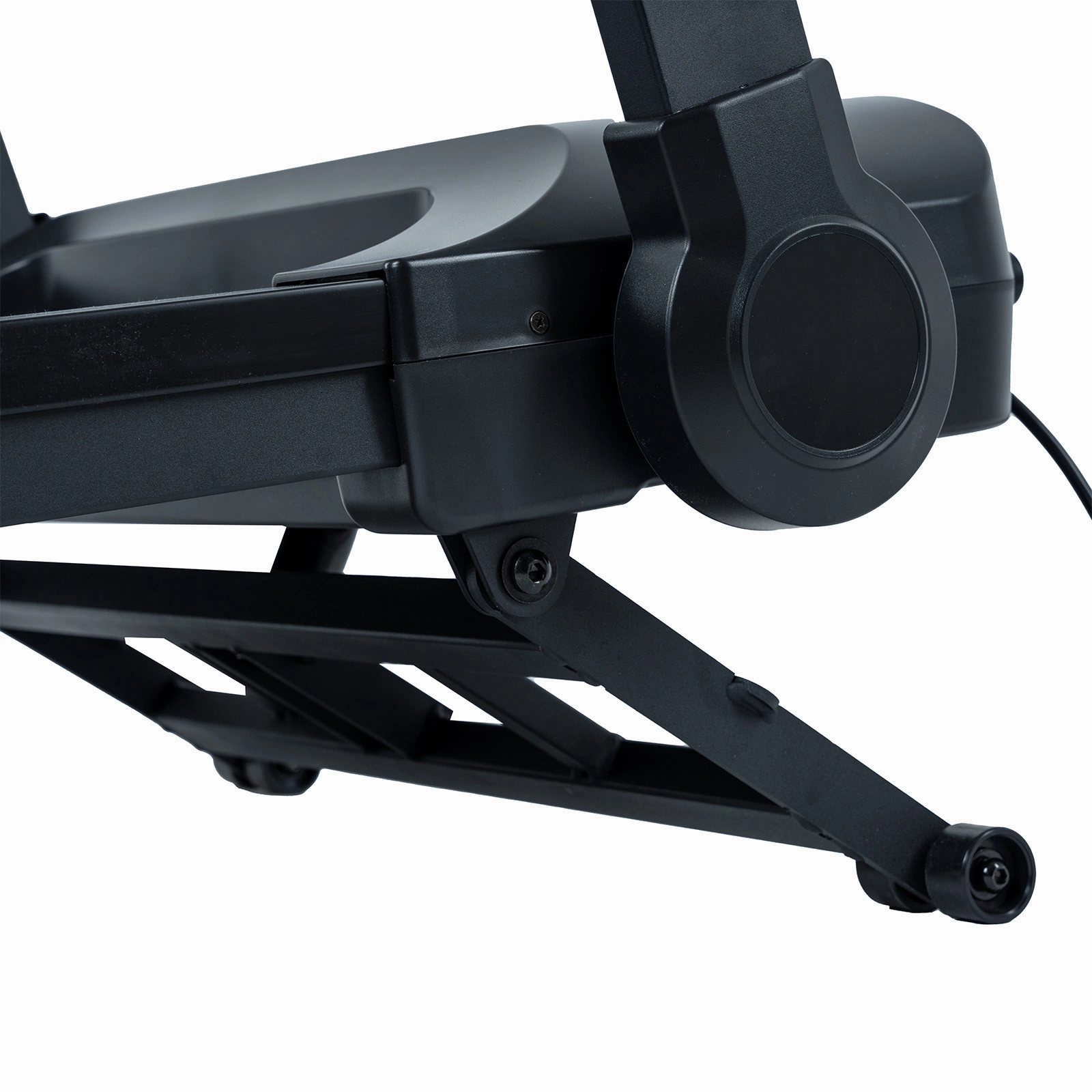 Bieżnia elektryczna TRACK 200 ma funkcję składania na płasko, dzięki której po skończonym treningu łatwo zmniejszysz zajmowaną przestrzeń. Złożenie bieżni zajmuje zaledwie kilka sekund. Blokadę umożliwiającą złożenie ramion bieżni zwalnia się za pomocą dźwigni umieszczonych pod poręczami. Dodatkowo kółka transportowe pozwolą na przesunięcie urządzenia w wybrane miejsce.