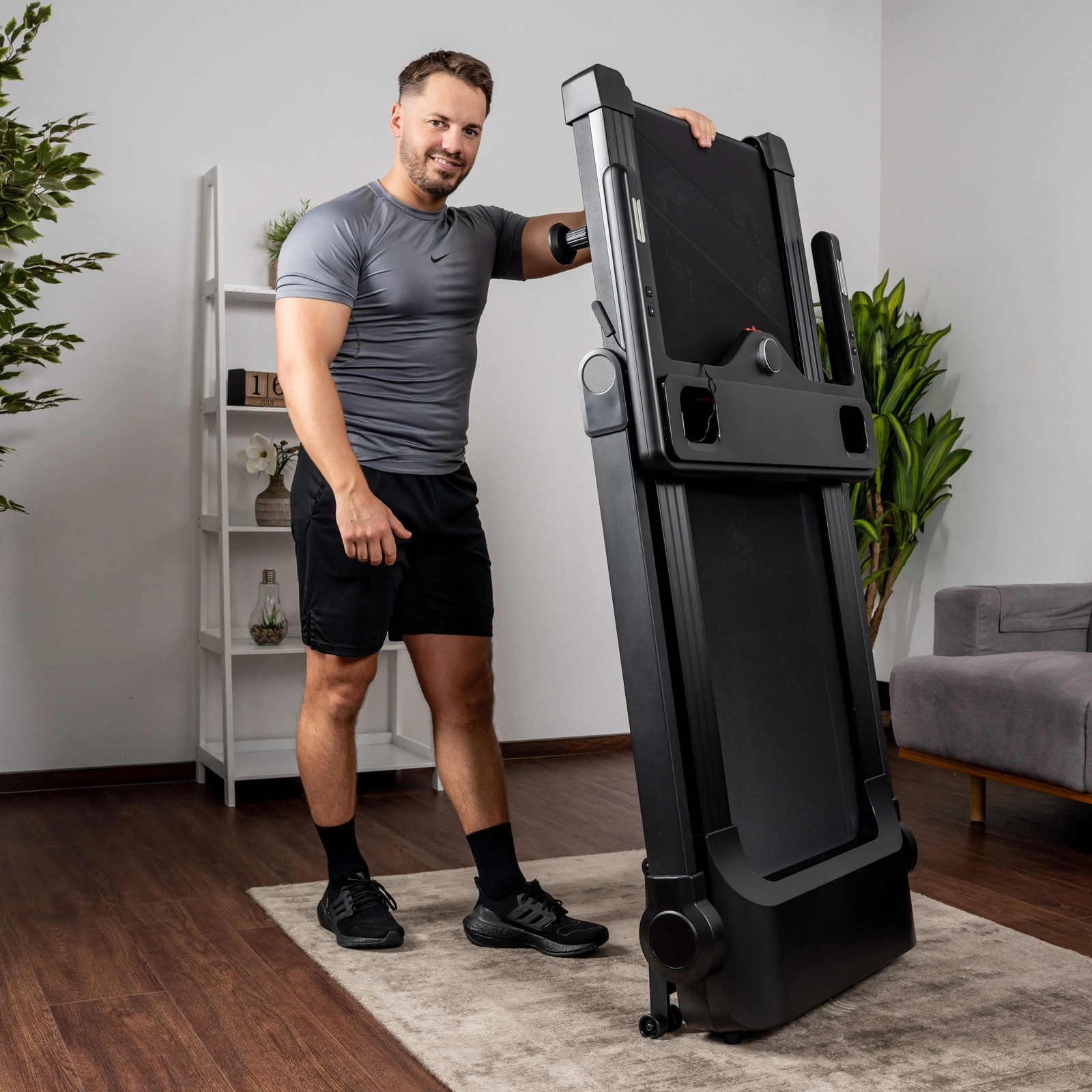 Po złożeniu, jej wysokość wynosi ok. 22 cm dzięki czemu bieżnia łatwo zmieści się nawet pod łóżko. Bieżnię można przechowywać także w pionie co ułatwia przechowywanie, pamiętaj jednak aby zabezpieczyć urządzenie, ustaw bieżnie przy ścianie lub opartą o mebel unikając obsunięcia.